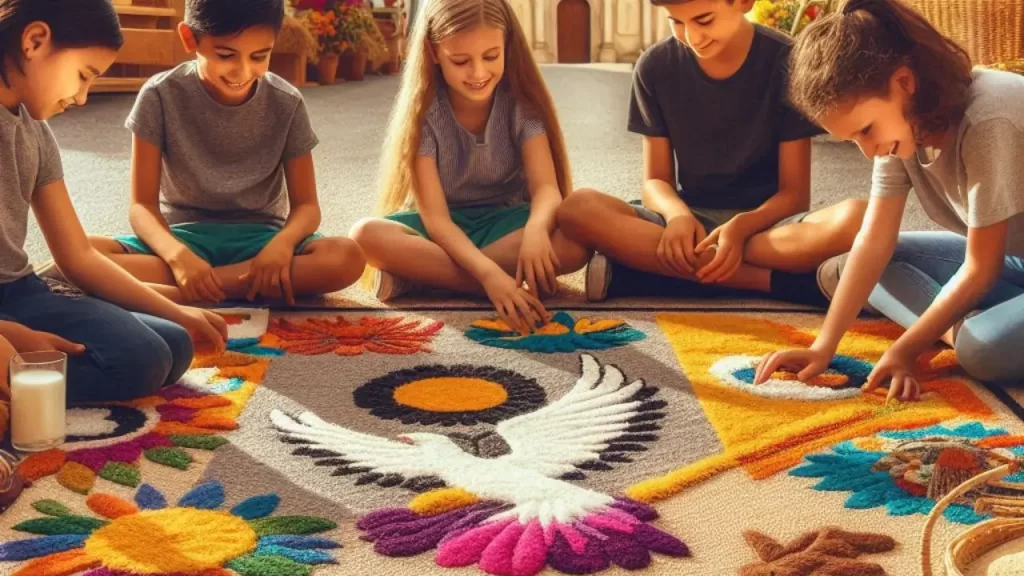 - Como Explicar: “Vocês já viram quando fazemos uma festa para alguém muito especial e decoramos a casa inteira? No Corpus Christi, as pessoas fazem como se estivessem preparando um tapete de festa para Jesus passar! Elas usam flores, areia colorida, sementes, serragem, tudo para fazer desenhos lindos na rua, mostrando que o caminho por onde Jesus passa é um caminho de beleza e amor.”